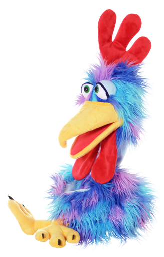 Dieser verrückte große Hahn ist eine Handpuppe von den Living Puppets und heißt Sir Theo von Gockel!