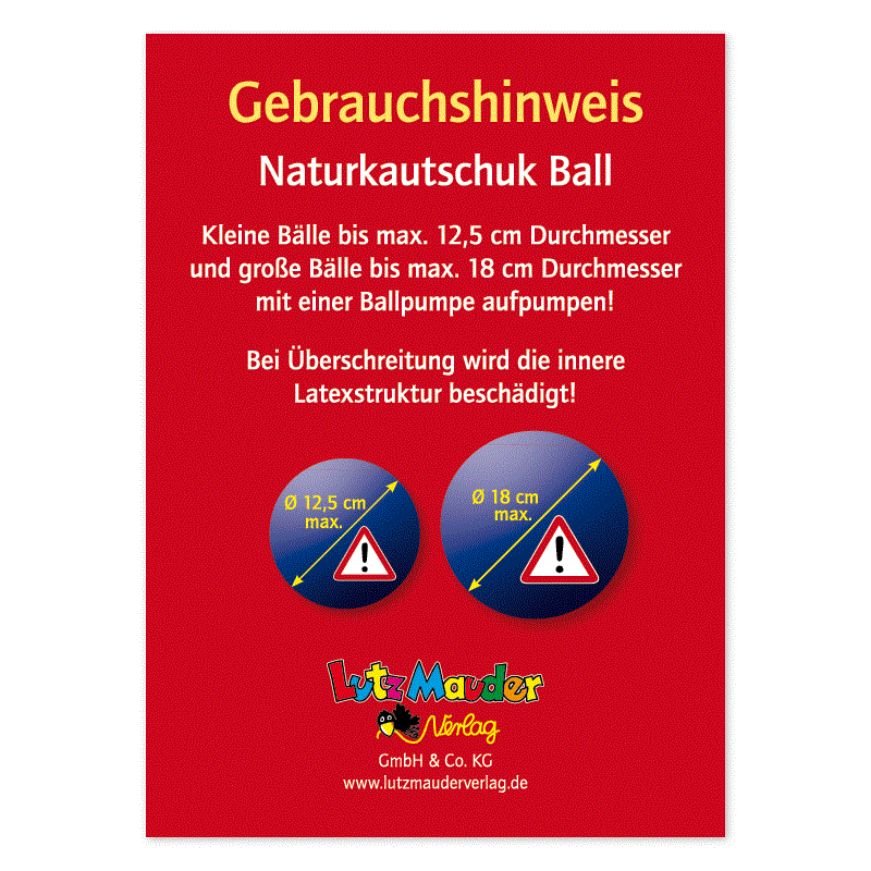 Diesen Ball bitte nur bis zu seinem Durchmesser von 18 cm aufpumpen. Bei Überschreitung droht die Beschädigung des Materials.