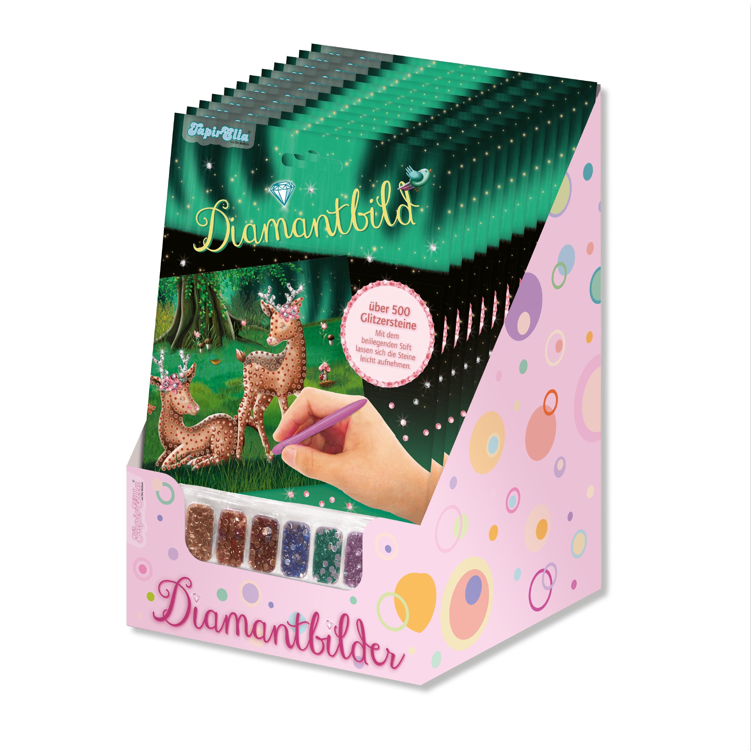 Ein hübsches Bastelbild mit Rehen auf einer Waldlichtung gilt es hier zu gestalten. Die Lutz Mauder TapirElla Diamantbilder sind ein toller Kreativ-Spaß mit extra Glitzer-Faktor! Stein für Stein werden die kleinen Diamant-Imitate mit dem Haftstift auf die Motivkarte gebracht. Das Ergebnis ist ein tolles Glitzermotiv, das die kleinen Künstlerinnen und Künstler staunen lässt.