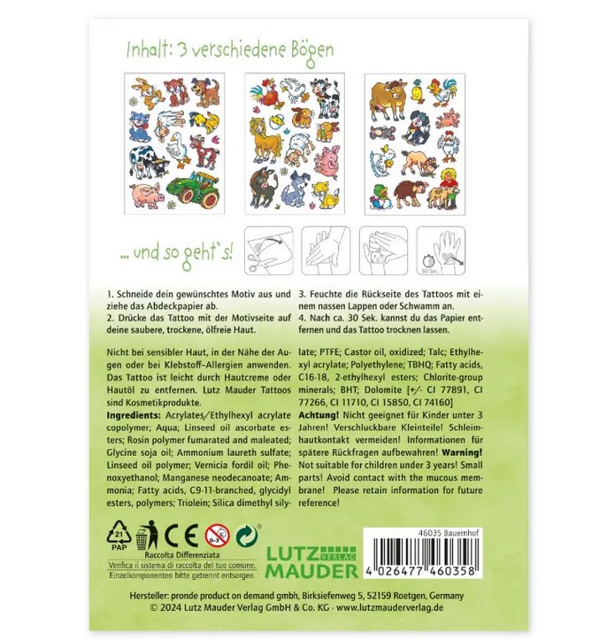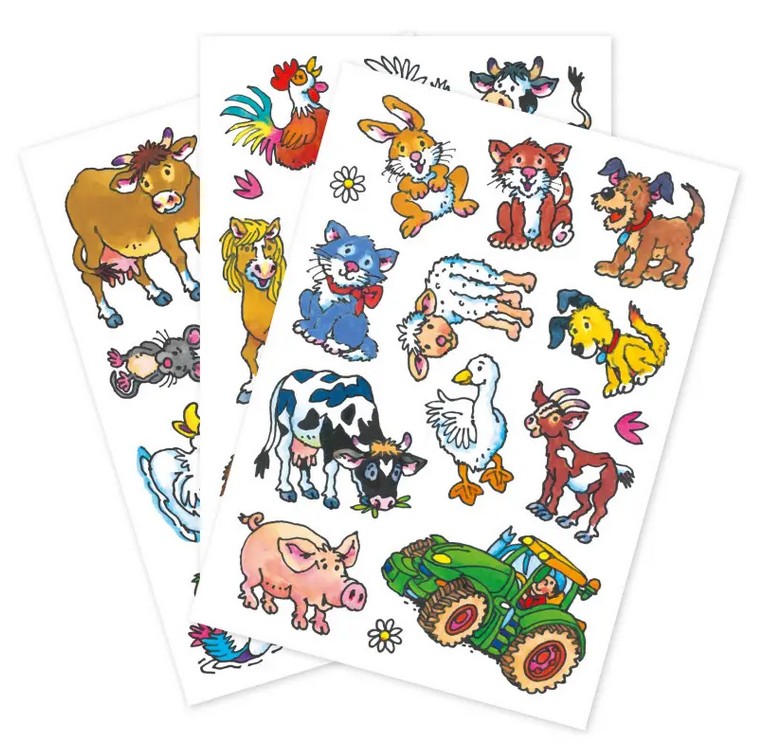 Hier gibt es einen ganzen Schwung Bauernhof-Kindertattoos vom Lutz Mauder Verlag. Verteilt auf 3 Papier-Bögen könnt ihr die Motive natürlich auch gut auseinander schneiden. Vielleicht für einen Kindergeburtstag?