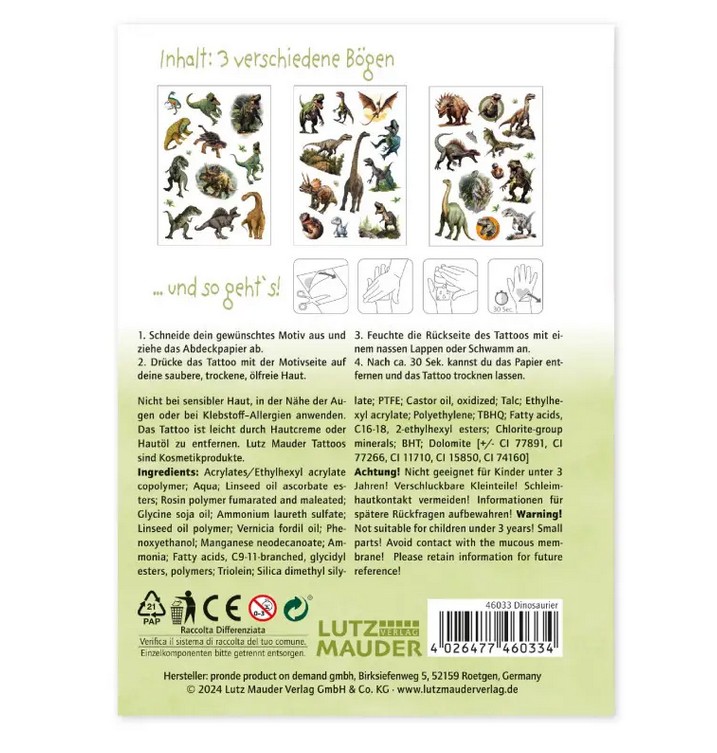 • Tattoo-Sets entsprechen der Kosmetikverordnung (EU Verordnung (EG) 1223/2009)