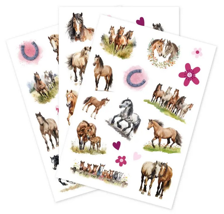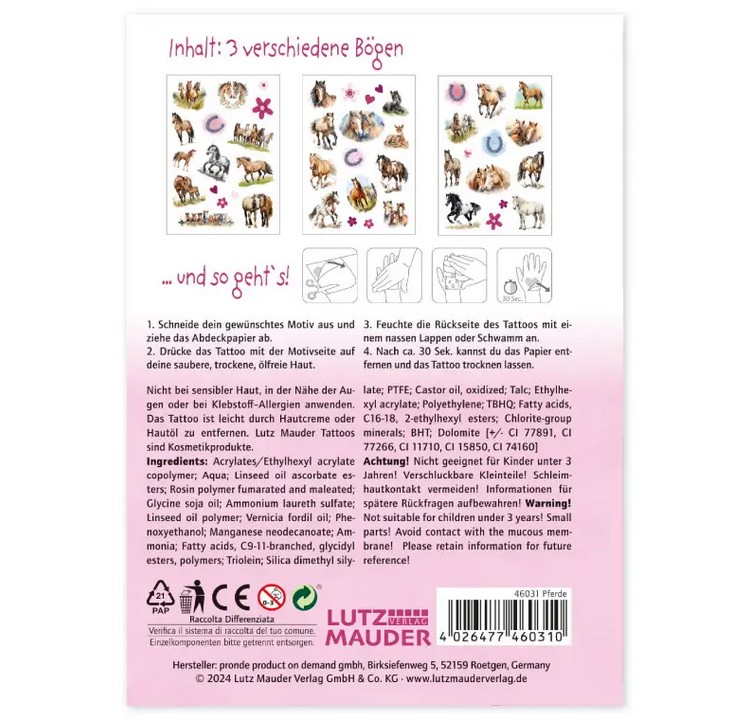 Hier gibt es einen ganzen Schwung Kindertattoos mit Pferdemotiven vom Lutz Mauder Verlag. Verteilt auf 3 Papier-Bögen könnt ihr die Motive natürlich auch gut auseinander schneiden. Vielleicht für einen Kindergeburtstag?
