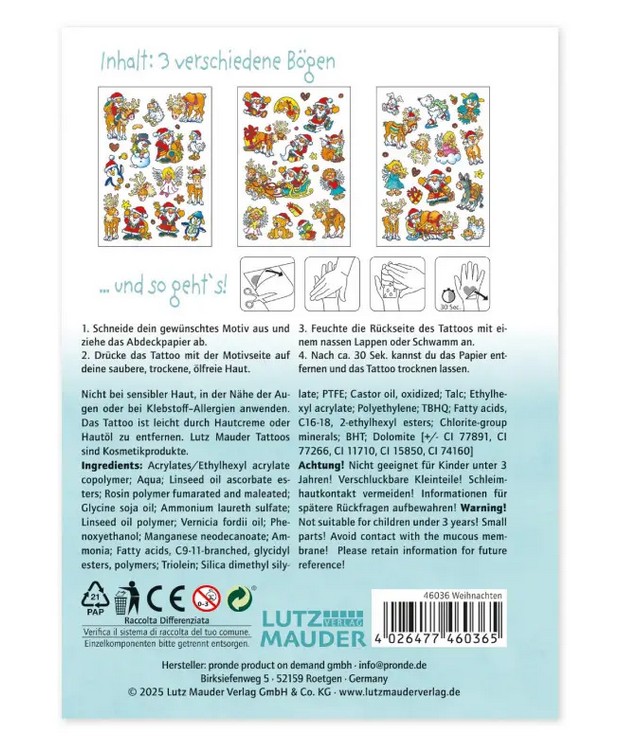 Hier gibt es einen ganzen Schwung weihnachtliche Kindertattoos vom Lutz Mauder Verlag. Verteilt auf 3 Papier-Bögen könnt ihr die Motive natürlich auch gut auseinander schneiden. Vielleicht steckt ihr welche in Adventskalendersäckchen?
