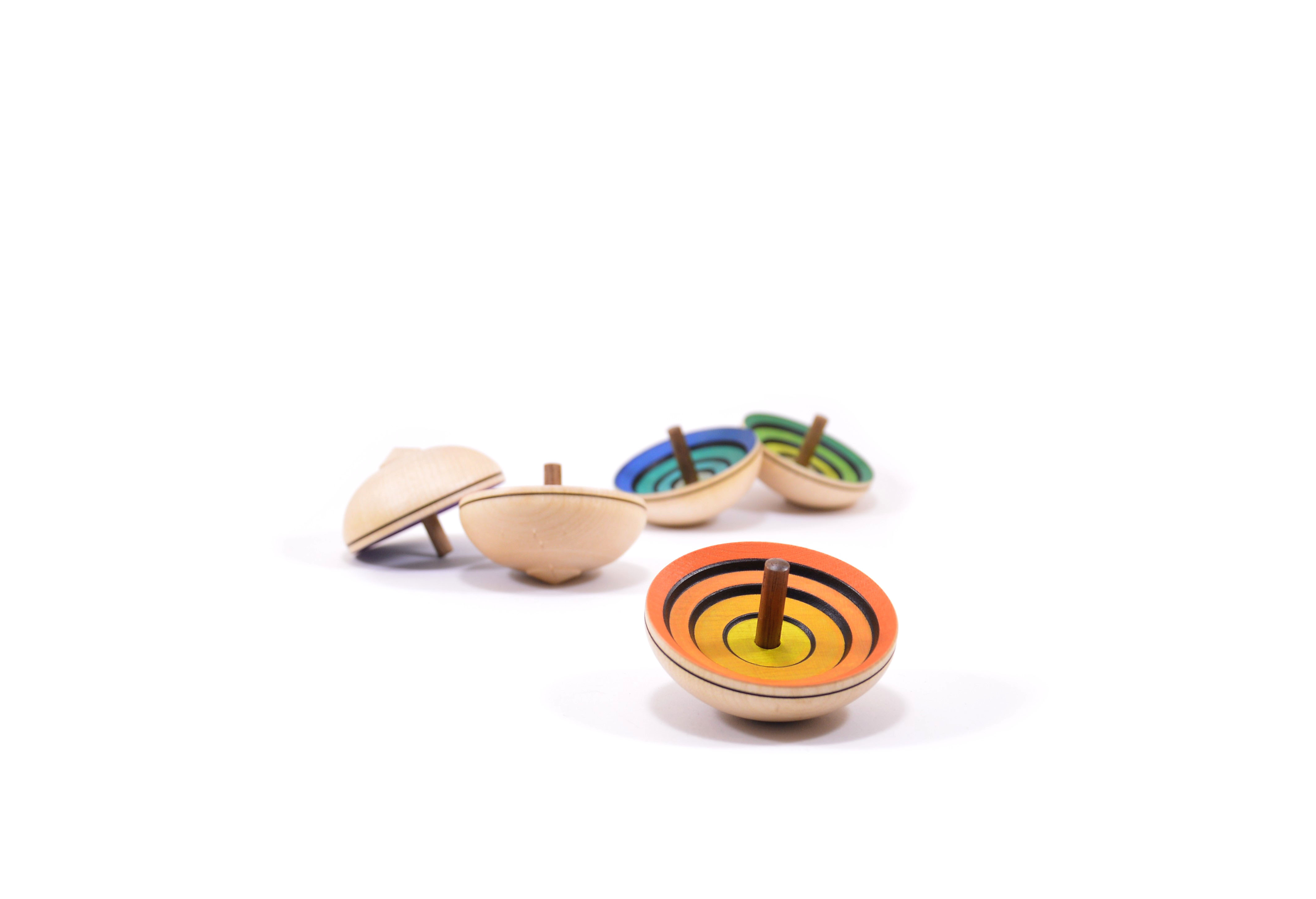 Bemalungen werden von Hand aufgetragen. Somit ist jeder Kreisel ein
