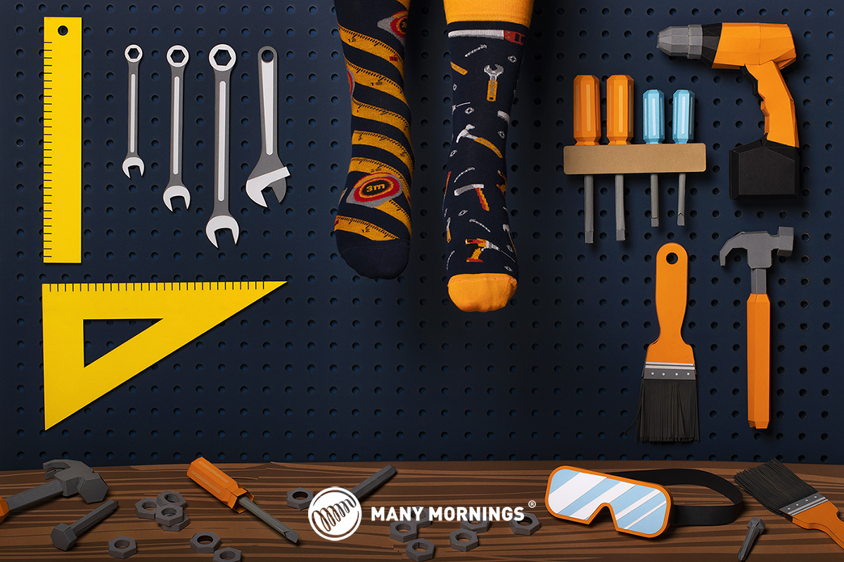 Die Many Mornings Socken The Handyman Gr. 43-46 sind ein echter Blickfänger und bezaubern alle Fans witziger Motivsocken. Das Besondere dabei: Das Paar besteht aus zwei verschiedenen Socken mit unterschiedlichen Motiven. So bringt schon das morgendliche Socken-Anziehen wunderbar viel Spaß und auch den Tag über kommt immer wieder Freude hoch.