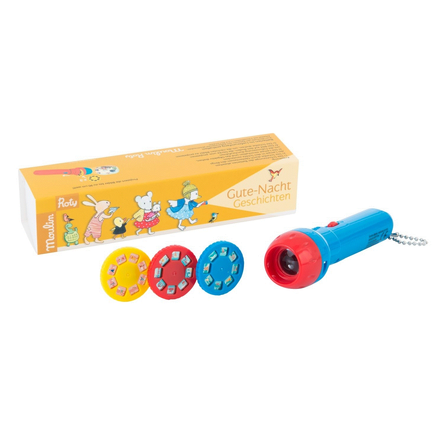 Die Taschenlampe kann auf jede beliebige Wand gerichtet werden und je nachdem welche Geschichtendrehscheibe eingelegt wurde zeigt sie nun 8 kleine Bilder. Diese können als kleine Geschichten die Fantasie beflügeln. Mit den Kindern kann man nun zusammen kreativ werden und sich jeden Abend aufs Neue eine einzigartige Geschichte zu den Bildern ausdenken.