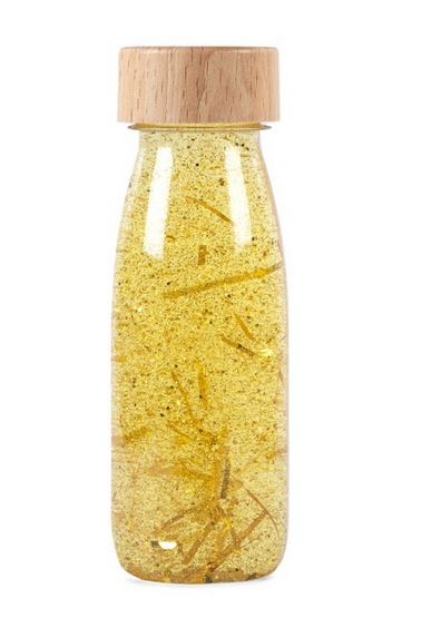 In der Float Bottle Gold gibt es eine zauberhafte bunte Welt zu entdecken. In der gelb gefärbten Flüssigkeit schweben verschiedene geformte Teilchen: Glitzerpartikel, Goldflitter, etc. Diese kann man schweben lassen, schütteln, im Licht beobachten.