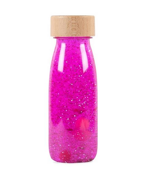 In der Float Bottle Pink gibt es eine zauberhafte bunte Welt zu entdecken. In der pink gefärbten Flüssigkeit schweben verschiedene geformte Teilchen: Glitzerpartikel, leichte Kugeln, etc. Diese kann man schweben lassen, schütteln, im Licht beobachten.