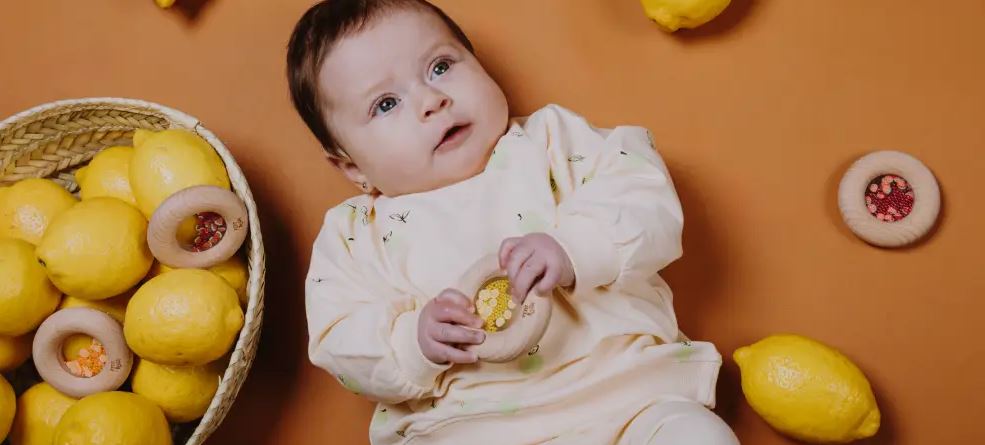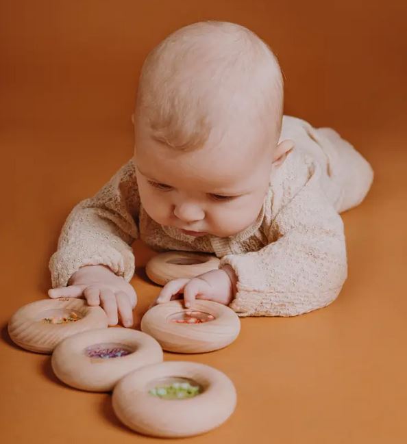 Sie beginnen zu rieseln und zu rasseln, wenn geschüttelt wird. Natürlich darf auf den Holzring gebissen werden und er ist auch gut zu greifen.