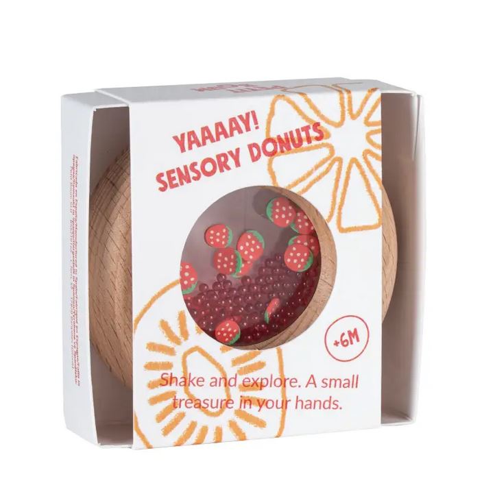 Dieser süße Baby-Greifling in Form eines Donuts ist ein tolles sensorisches Spielzeug von Petit Boum. Der Holzring hat in seiner Mitte ein sicher eingeschlossenes Feld mit kleinen Rieselelementen - hier auch Erdbeerteilchen!