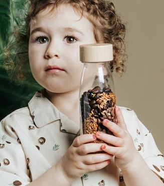 In den sicher verschlossenen Sensorik Flaschen (Sensory Bottles) von Petit Boom gibt es kleine Welten zu entdecken. Glitter, Fische oder Bubbles, die in bunten Flüssigkeiten schweben, rasselnde Kaffeebohnen, Muscheln oder Einhörner in buntem Sand. Die Sinne werden angesprochen und es macht den kleinen Kinder einfach Spaß zu entdecken.