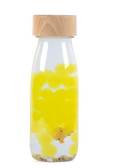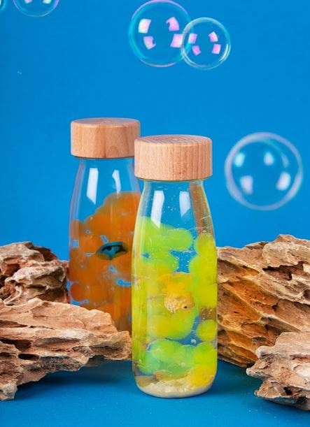 In der Sound Bottle Fish gibt es eine wunderbare Unterwasser-Welt zu beobachten und zu hören. In der durchsichtigen Flüssigkeit schweben verschiedene geformte Teilchen: gelbe leichte Kugeln, Glitzermuscheln, Sand etc. Diese kann man schweben lassen, schütteln, im Licht beobachten. Dazu noch ein lustiger Kugelfisch, der sich immer wieder hier- und dahin bewegt. Wird die Flasche geschüttelt, gluckst und rasselt es.