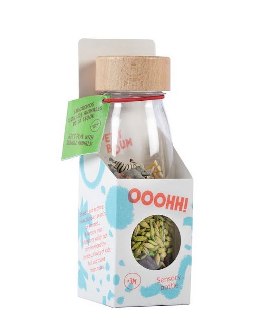 In den sicher verschlossenen Sensorik Flaschen (Sensory Bottles) von Petit Boom gibt es kleine Welten zu entdecken. Glitter, Fische oder Bubbles, die in bunten Flüssigkeiten schweben, rasselnde Kaffeebohnen, Muscheln oder Einhörner in buntem Sand. Die Sinne werden angesprochen und es macht den kleinen Kinder einfach Spaß zu entdecken.