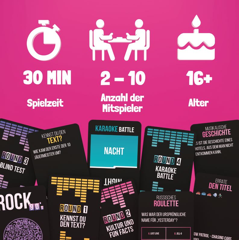 • mehr als 200 Fragekarten, die Hits aus den letzten 100 Jahren abdecken
