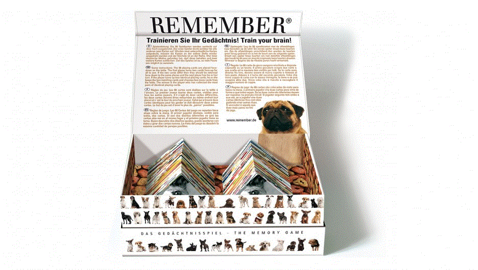 Das Design der Packung und der Spielkarten weist untrüglich auf den Hersteller hin: Auch wenn in diesem Fall Hunde und nicht grafische Muster der Star sind - wir erkennen Remember wieder!.