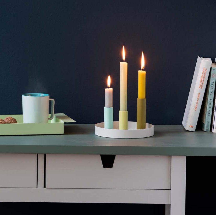 Zum Verschenken, zum Behalten, einfach zum Verlieben: Dank integrierter Magnete können die Kerzenhalter rutschfest und kippsicher immer neu auf dem Tablett positioniert werden.