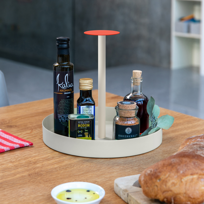 Das runde Metalltablett Nana von Remember sieht nicht nur gut aus, es ist auch praktisch. Mit dem Griff lässt sich Nana schnell von A nach B stellen.