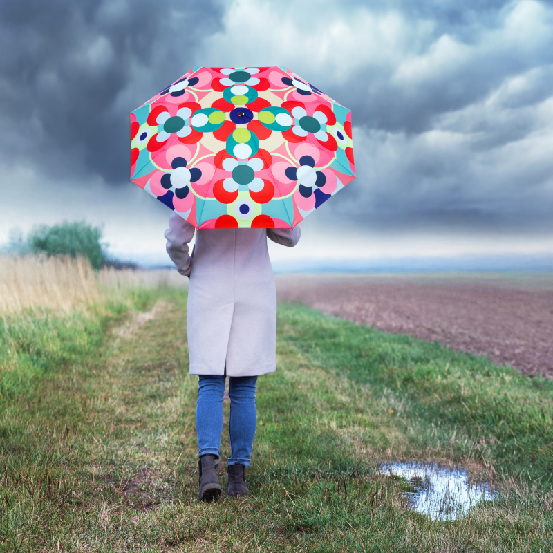 Der Taschen-Regenschirm Sushi von Remember mit blumigem Design. Das tolle Design sorgt auch bei bewölktem Himmel für gute Stimmung.