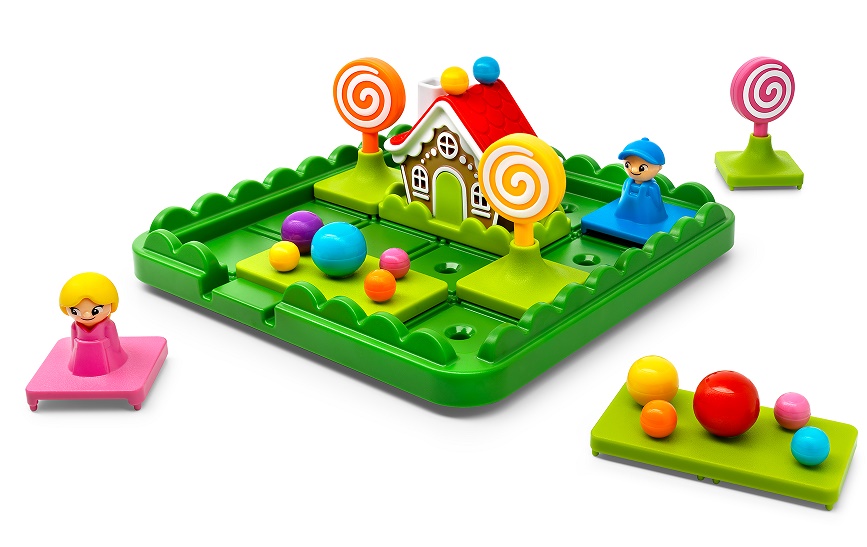 Gar nicht so leicht: Nur die Süßigkeitenplättchen und die Kinder sind recht frei beweglich. Das Hexenhaus kann gar nicht verschoben werden und die Lollis haben nur einen Feldzug frei. Wie kommt Hänsel zum Gartentor?