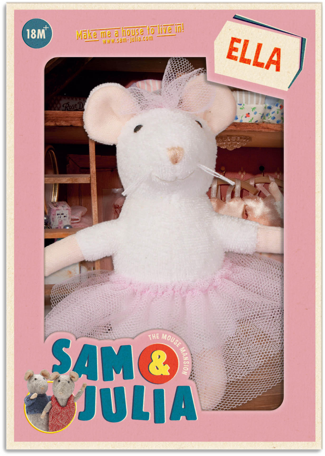 Maus Ella tanzt und wohnt auch im Sam und Julia Mäusehaus. Sie ist eine kleine Ballerina und manchmal tritt sie sogar im Theater auf.