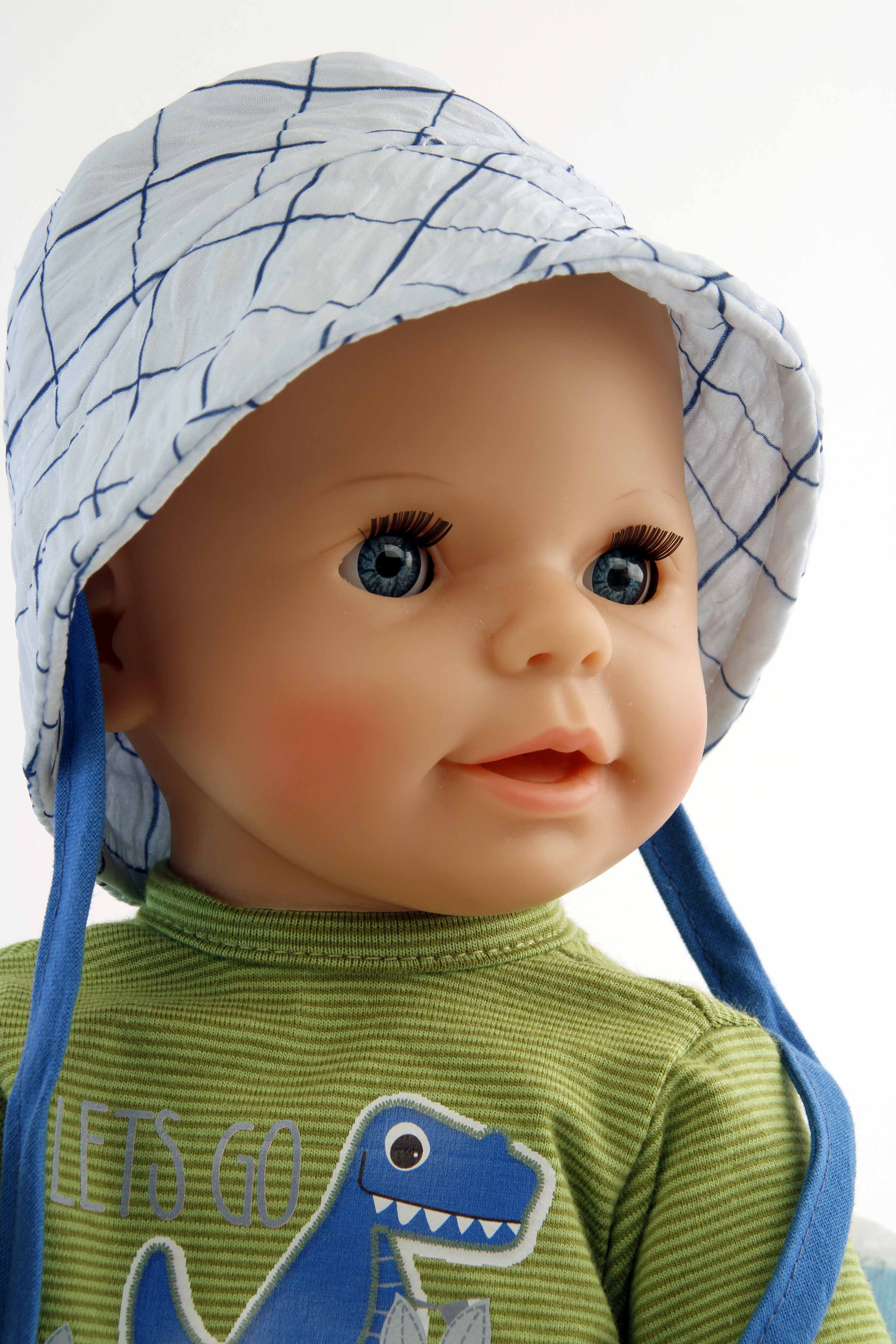 Trink- und Nässbaby Finn ist 40cm groß und trägt Shirt und Hose. Damit der Kopf schön warm bleibt eine Mütze.