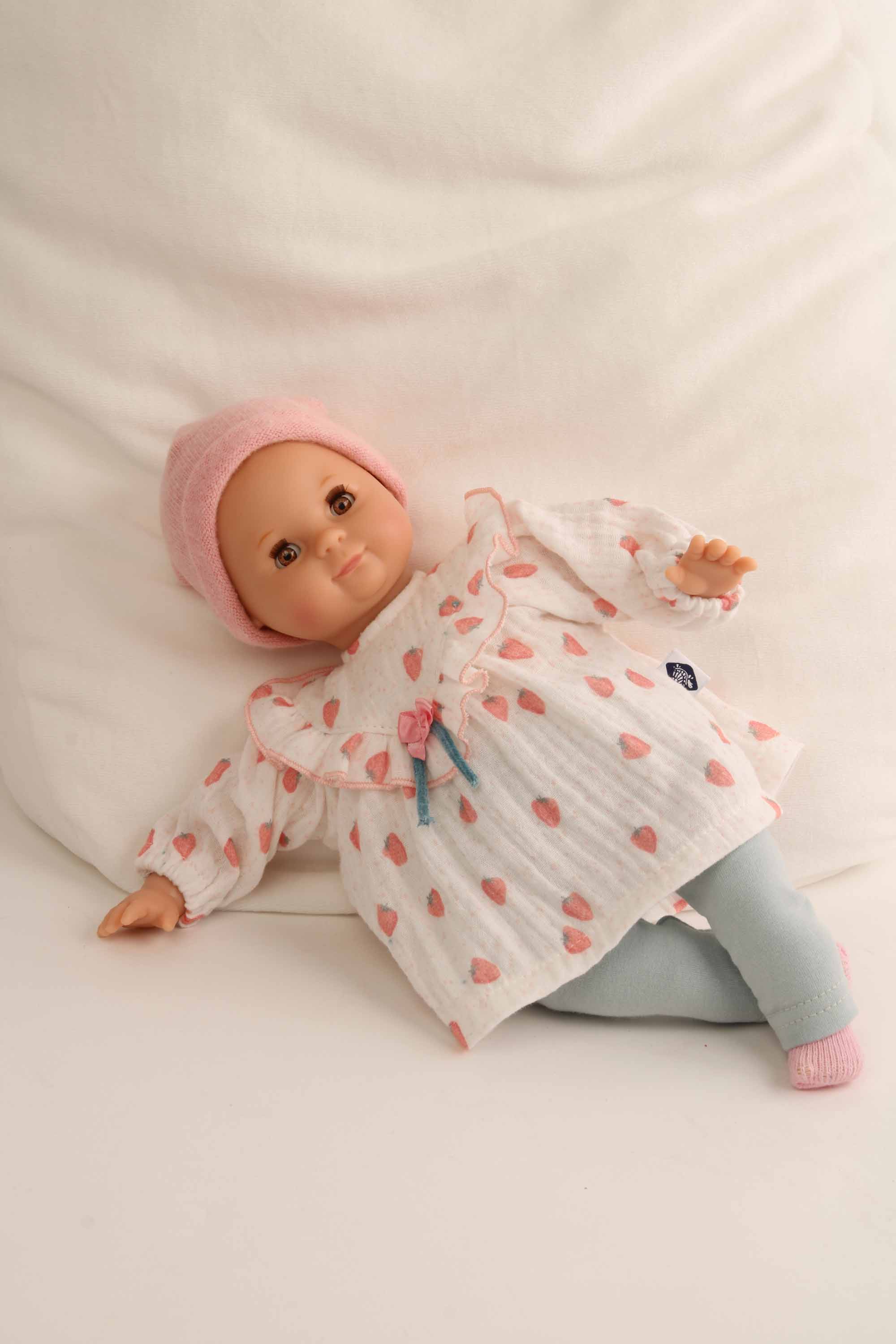 Hier haben wir eine hübsche Babypuppe aus der Schlummerle-Reihe im Sortiment: Sie hat lustige braune Schlafaugen und gemalte Haare. Die niedliche Kleidung und Mütze ist leicht an- und ausziehbar und bei 30 Grad per Hand waschbar. Babypuppe Schlummerle ist ein Schildkröt-Klassiker. Es gibt die eher kleine süße Babypuppe in Varianten mit und ohne Haare. Der Körper ist weich. Arme, Beine und Kopf sind aus Vinyl.
