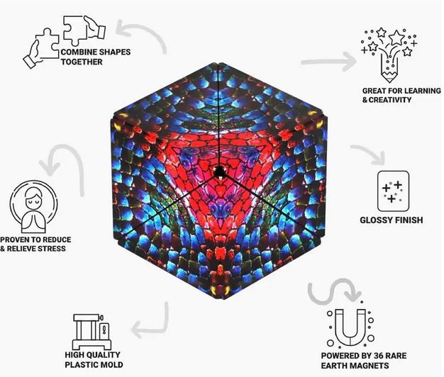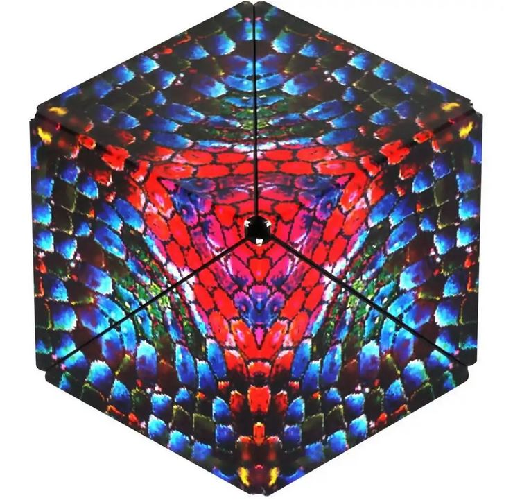 Der Magnetwürfel Chameleon von Shashibo Cube ist ein faszinierendes 3D-Lernpuzzle. Man kann daraus einen einfachen Würfel bauen, aber auch viele andere Formen. Denn die 12 Einzel-Pyramidenteile sind mit Scharnieren verbunden und werden durch je 3 Magnete miteinander zu einer großen Form verbunden. Der Chameleon Cube trainiert so das räumliche Vorstellungsvermögen, regt die Kreativität an und übt Geduld. Und dann sieht das ganze auch noch so gut aus, daß man es sich als Deko ins Regal stellen kann. Die aufgedruckten Chameleon-Muster transformieren zu zahllosen schönen neuen Ornamenten. Faszinerend!