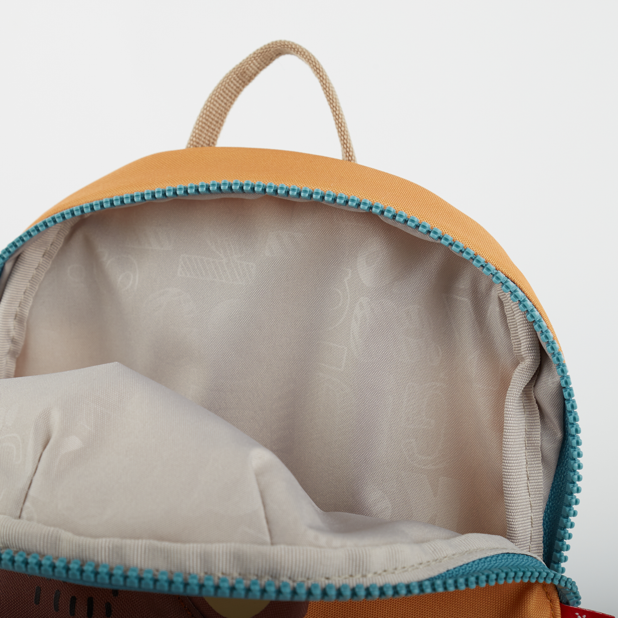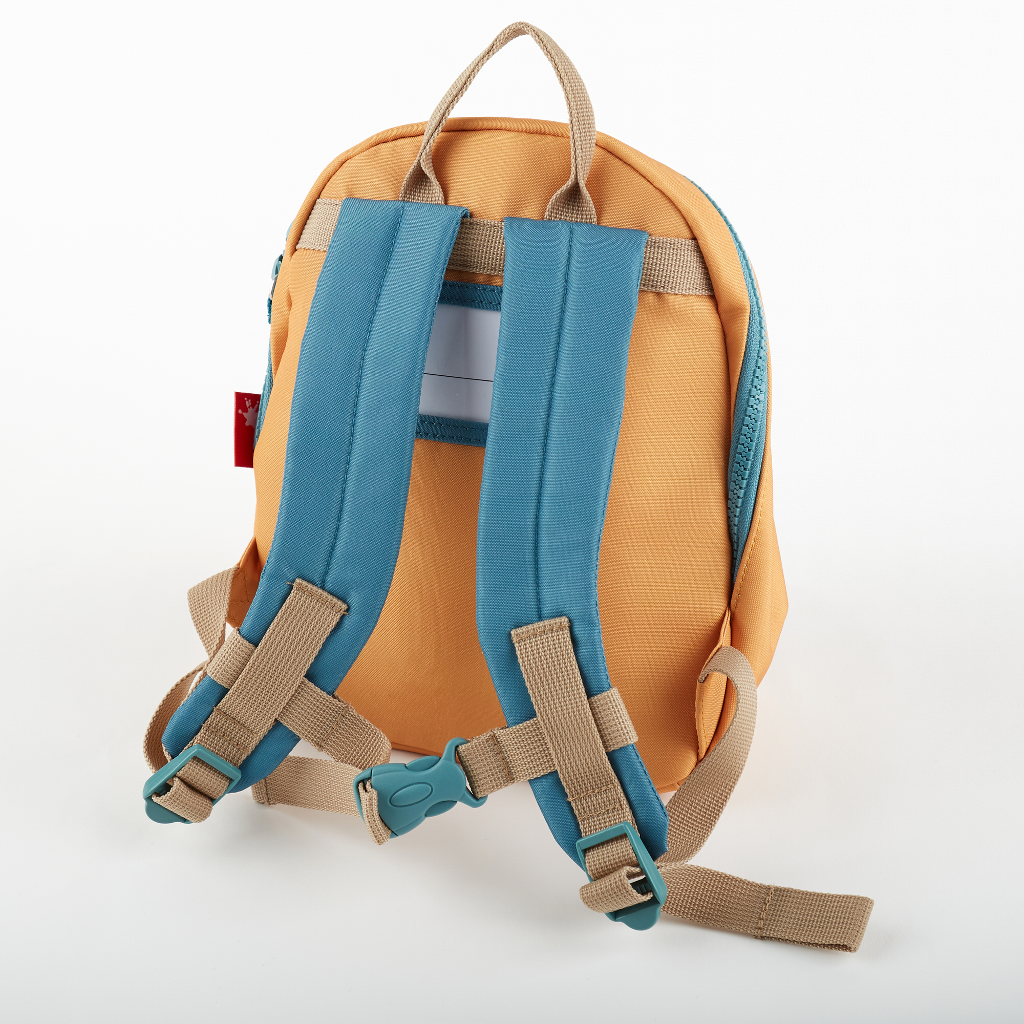 Ein orangefarbener Original Sigikid Mini Rucksack mit aufgenähtem Bärenmotiv.