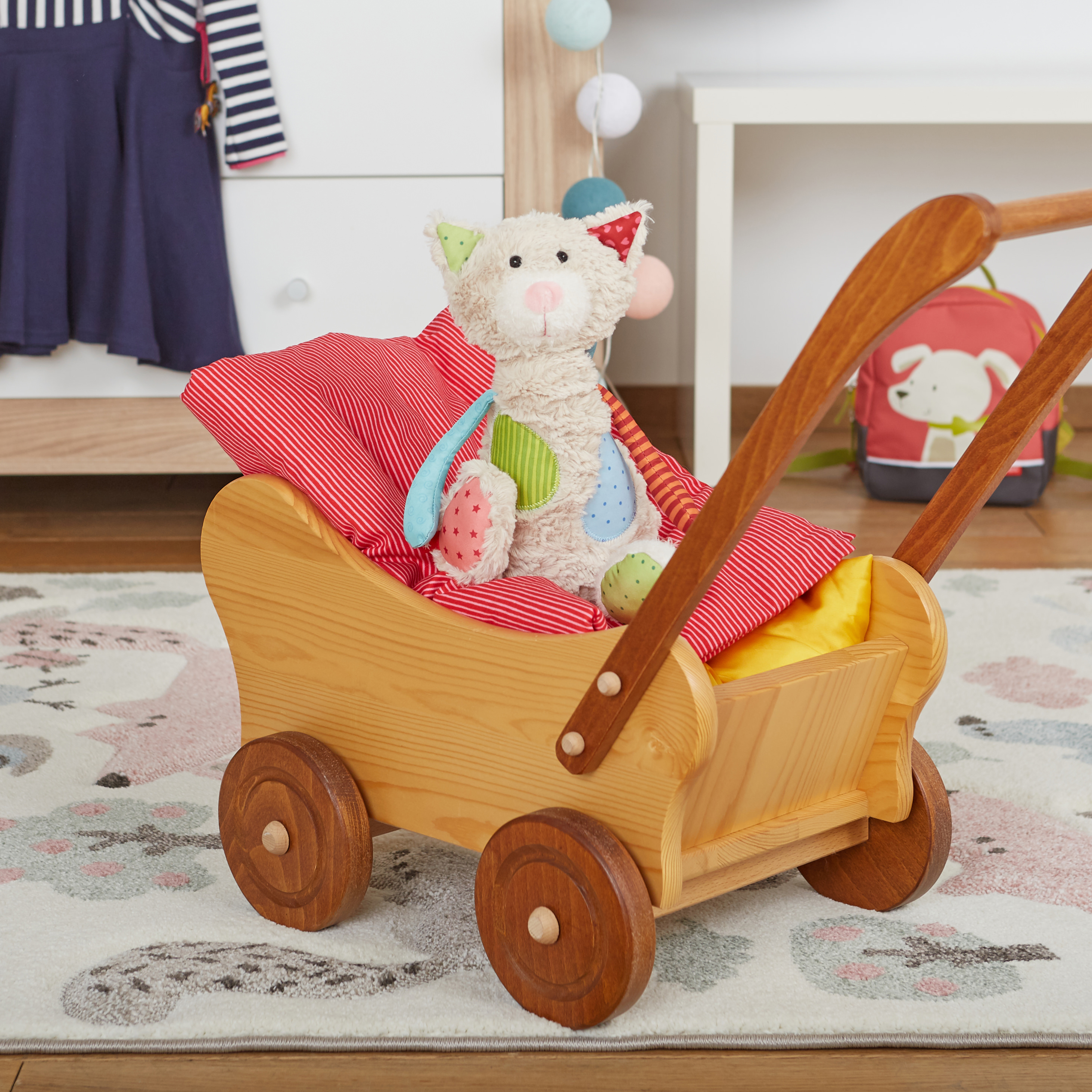 Arme und Beine schlenkern, das Stofftier sitzt gut durch Granulat im Popo.