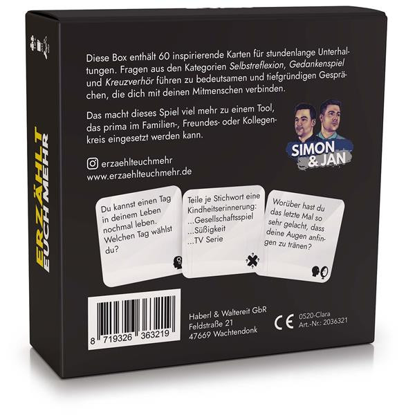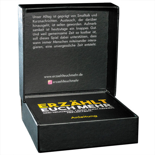 Die Karten in dieser Box haben ein Ziel: Gespräche fördern. Echte, tiefgründige bedeutsame Gespräche, die dich mit deinen Mitmenschen verbinden. Statt Smalltalk und Kurznachrichten denkt und sprecht ihr gemeinsam über Themen, die darüber hinausgehen und habt eine richtig gute Zeit miteinander.