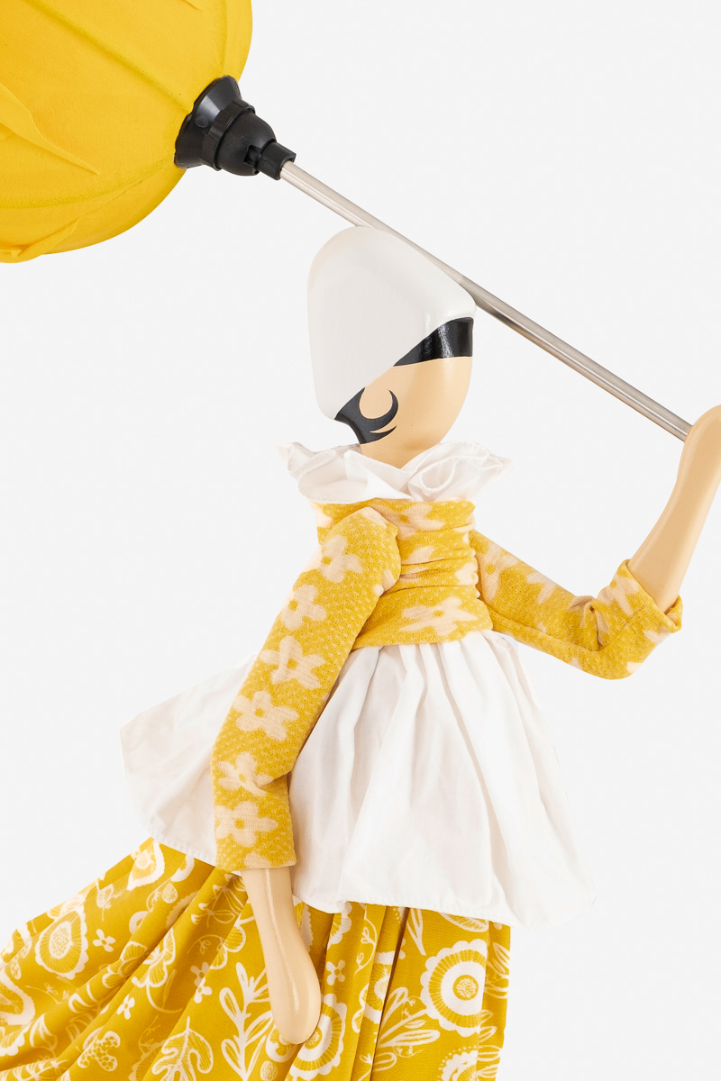 Diese Lampe von Skitso zeichnet sich durch das ungewöhnliche Design aus. Eine Frau mit Schirm und Rock wird vom Winde verweht.