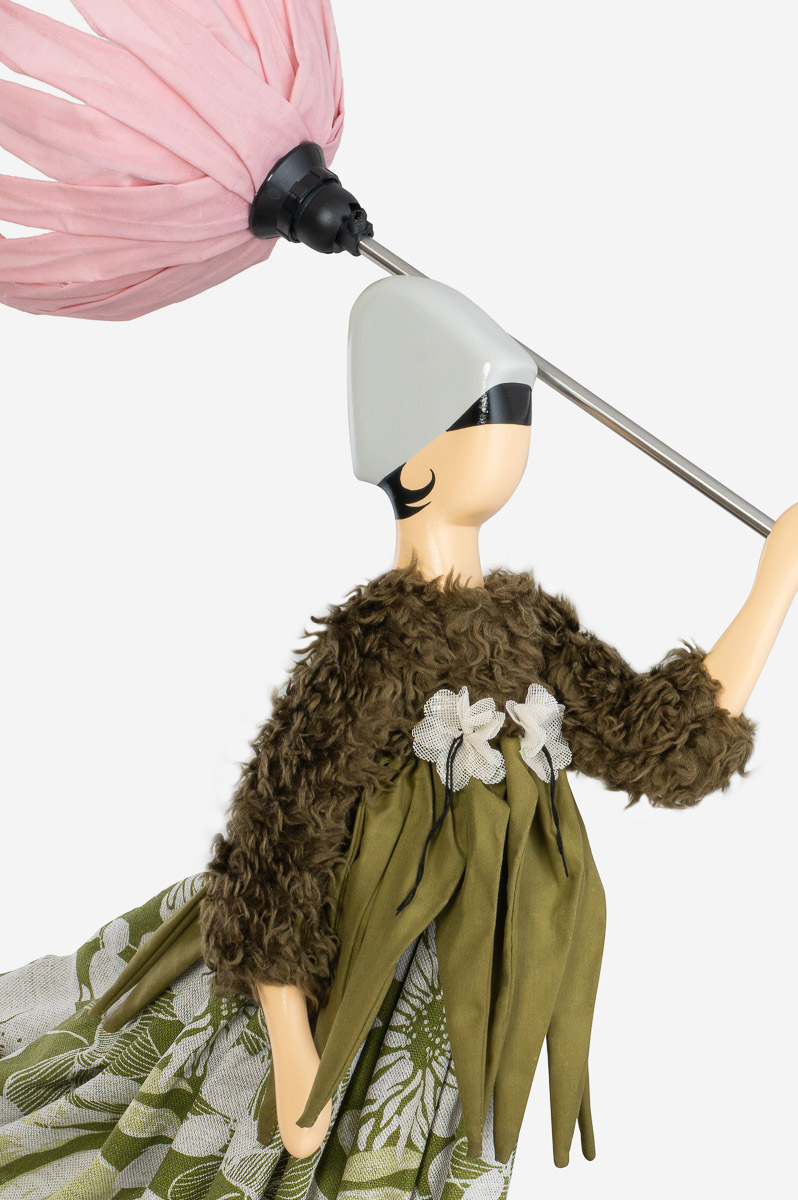 Diese Lampe von Skitso zeichnet sich durch das ungewöhnliche Design aus. Eine Frau mit Schirm und Rock wird vom Winde verweht.