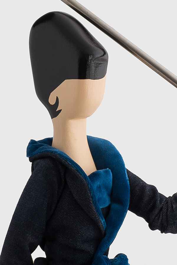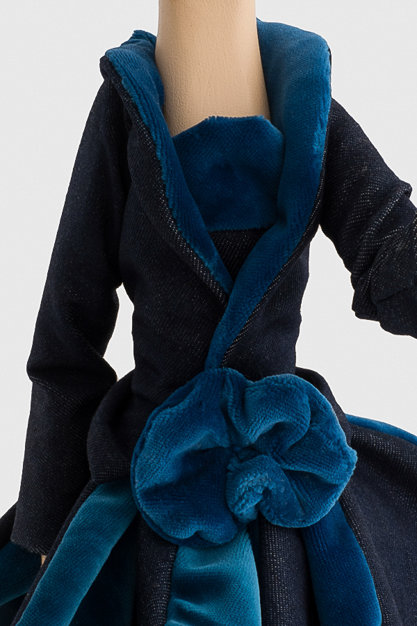 Girl Lamp Victoria trägt einen gemütlichen und samtigen blauen Mantel.
