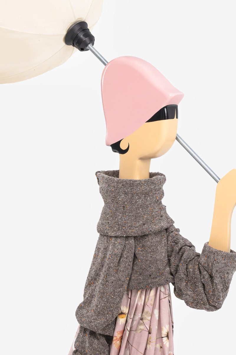 Die wunderbare Skitso Lampe Girl Lamp als große Stehlampe: Hier die Peggy XL! Die handgearbeiteten Lampen aus Griechenland sind einfach unwiderstehlich und originell. Peggy trägt einen grauen Pullover mit Turtleneck, dazu einen rosa Rock mit edlen floralen Motiven, sehr schick! Der Lampenschirm ist cremeweiß.