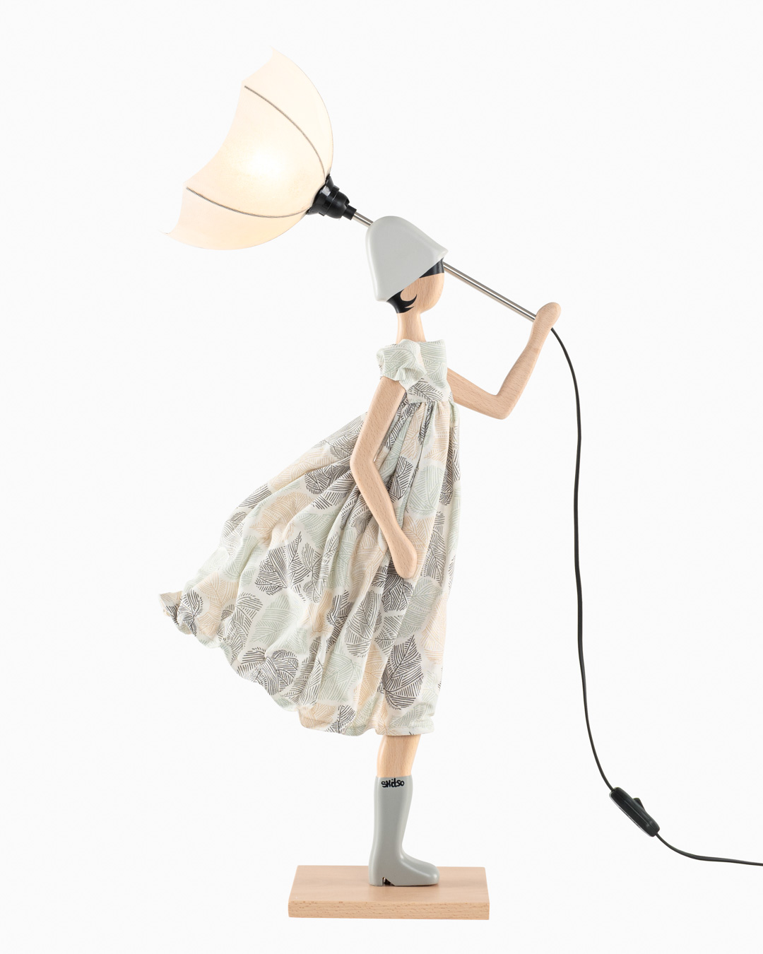 Diese Lampe von Skitso zeichnet sich durch das ungewöhnliche Design aus. Eine Frau mit Schirm und Rock wird vom Winde verweht.