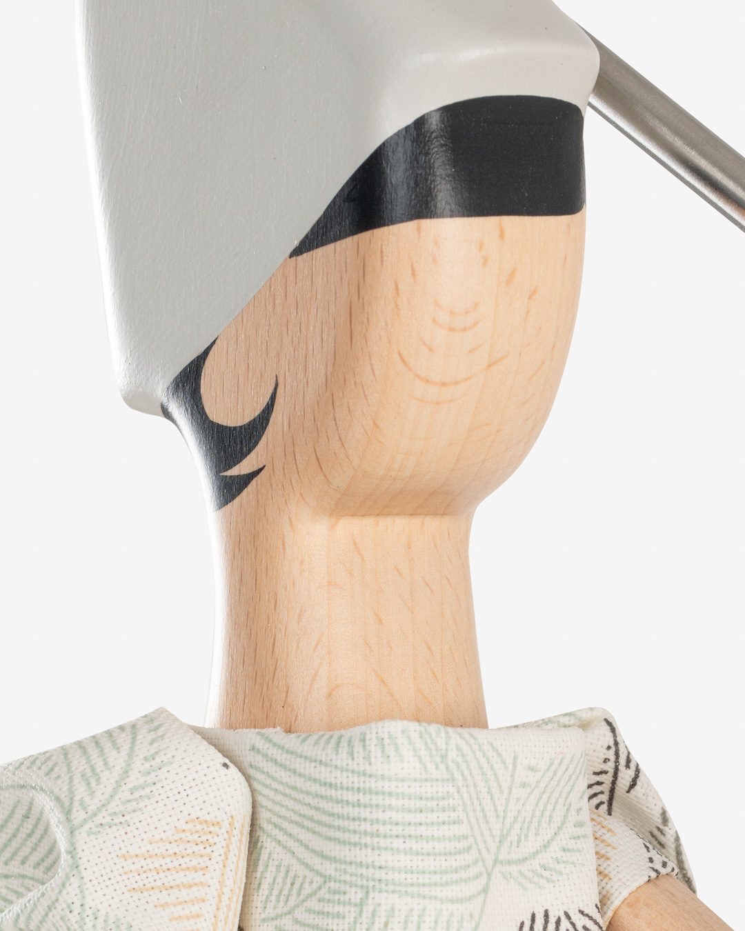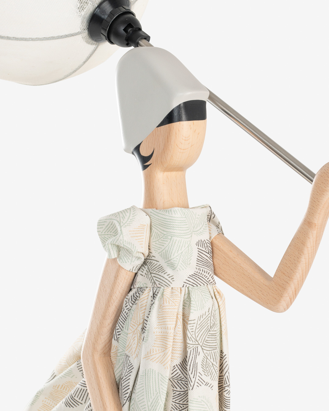 Girl Lamp Aiva von Skitso ist eine wunderschöne Tischlampe in hellen Farbtönen. Das cremeweiße Kleid ist mit feinen Blattmotiven bedruckt. Aiva gehört in die Sonderedtion von Skitso zum 40jährigen Bestehen der Lampen. Diese Sonderserie hat einen Buchenholzfuß und in Gesicht und Armen der Lampe ist ebenfalls das Buchenholz in natur zu sehen (s. Detailbild).