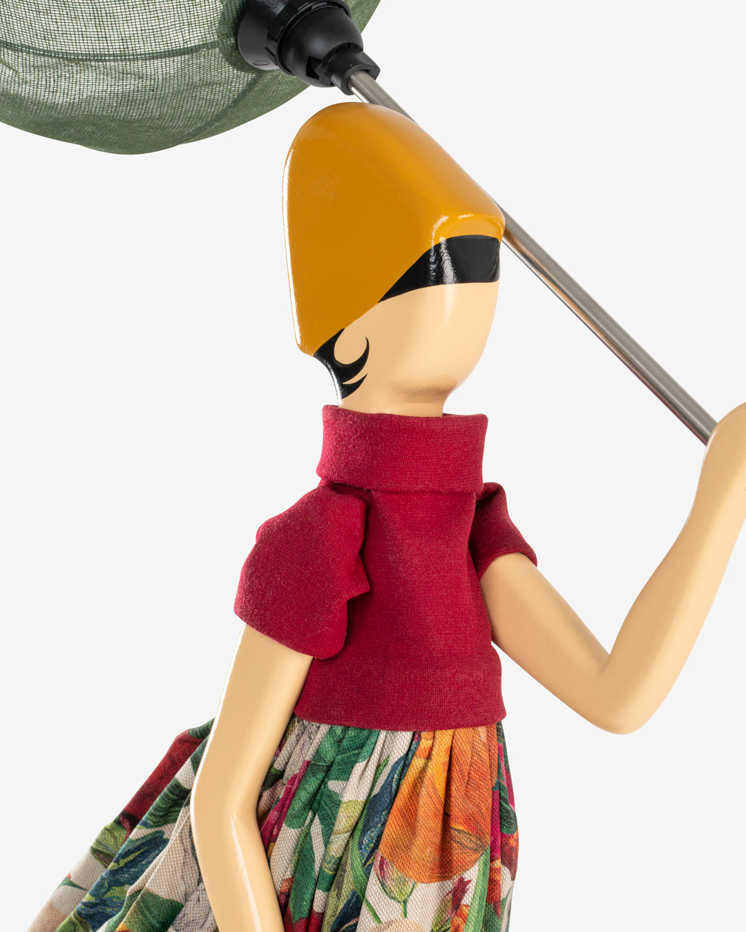 Der hochwertige Lampenkörper wird in Handarbeit von einer griechischen Manufaktur hergestellt. Auch die Farben werden liebevoll von Hand aufgetragen. Die Figur besteht aus Massivholz und steht auf einer Holzplatte. Die Kleidung besteht aus versteiften Textilien. In der unteren Saumkante ist ein Draht eingearbeitet, mit dem der Rock/Mantel vorsichtig entfaltet werden kann und so den Windstoß sichtbar macht. Das Leuchtmittel wird im Regenschirm eingesetzt, der mit einer Metallstange mit der Figur verbunden ist.