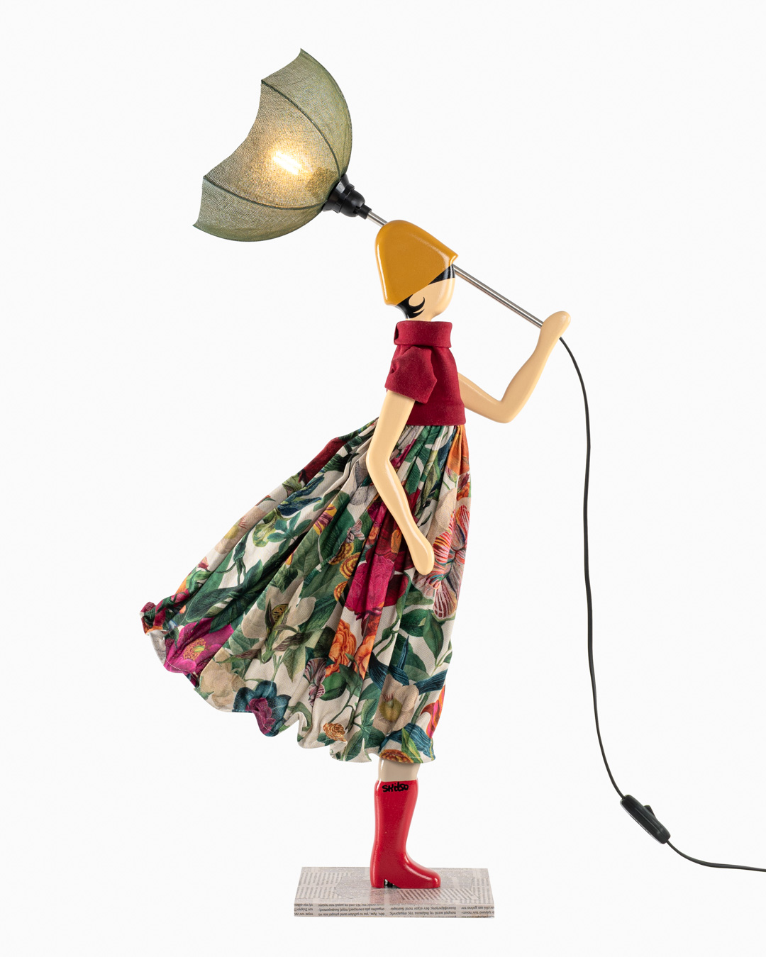 Diese Lampe von Skitso zeichnet sich durch das ungewöhnliche Design aus. Eine Frau mit Schirm und Rock wird vom Winde verweht.