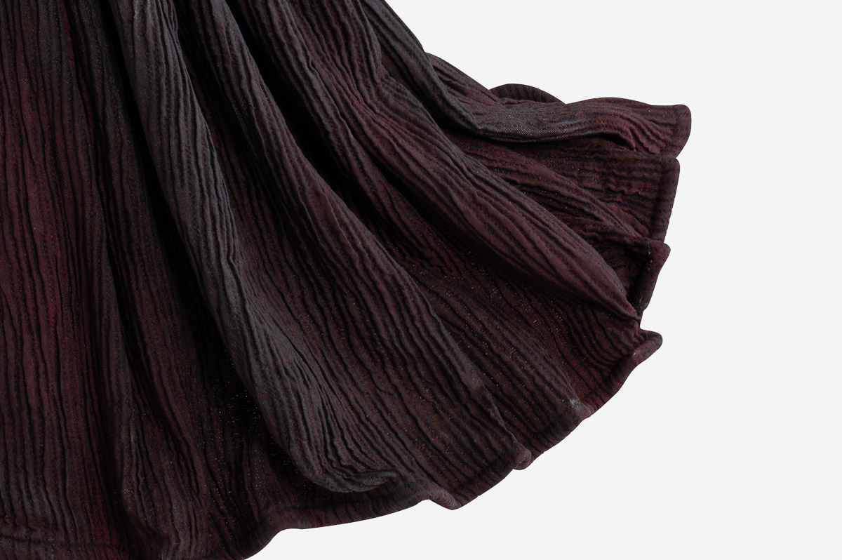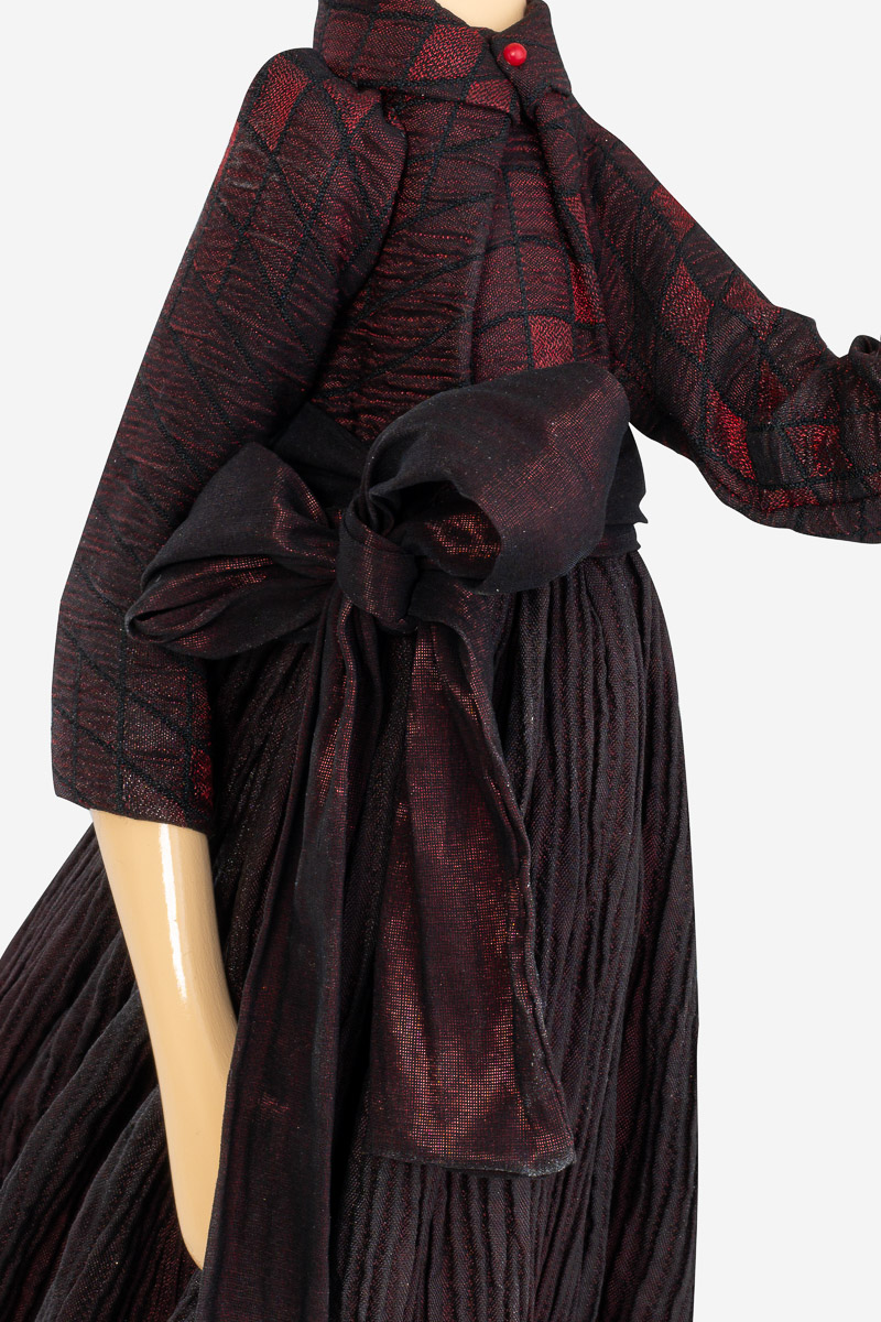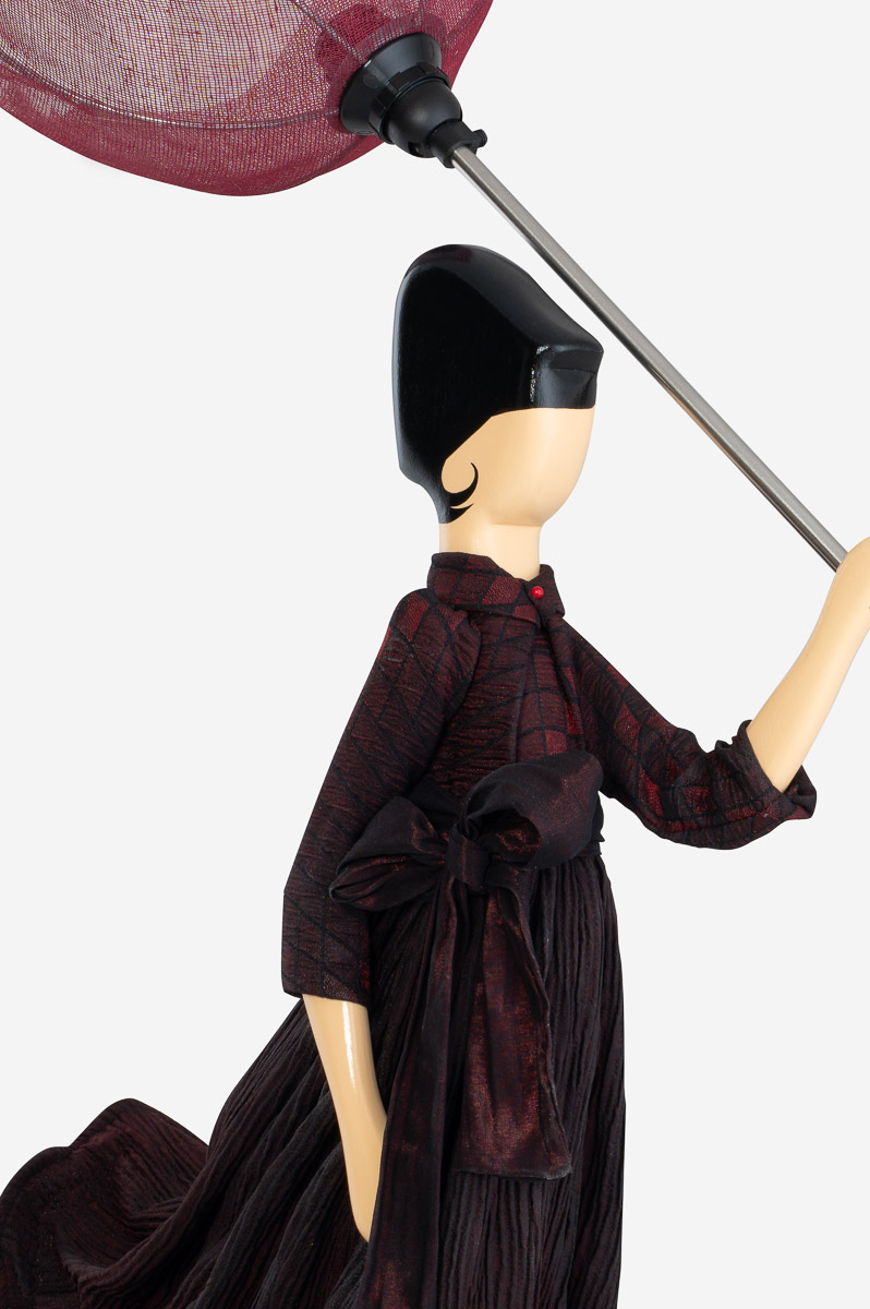 Girl Lamp Amanta von Skitso hat einen theatrale Look mit schwarzen und tiefroten interessant gemusterten Stoffen. Amanta ist eine kunstvolle Tischlampe aus griechischer Handarbeit.