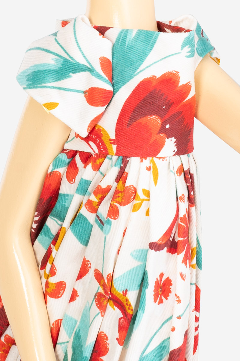 Girl Lamp Andrea von Skitso trägt ein fröhlich leuchtendes Outfit mit Blumen in Hellrot und Blau. Sie ist eine kunstvolle Tischlampe aus griechischer Handarbeit. Sie entspringt der Herbstkollektion, versprüht aber sommerliches Flair.