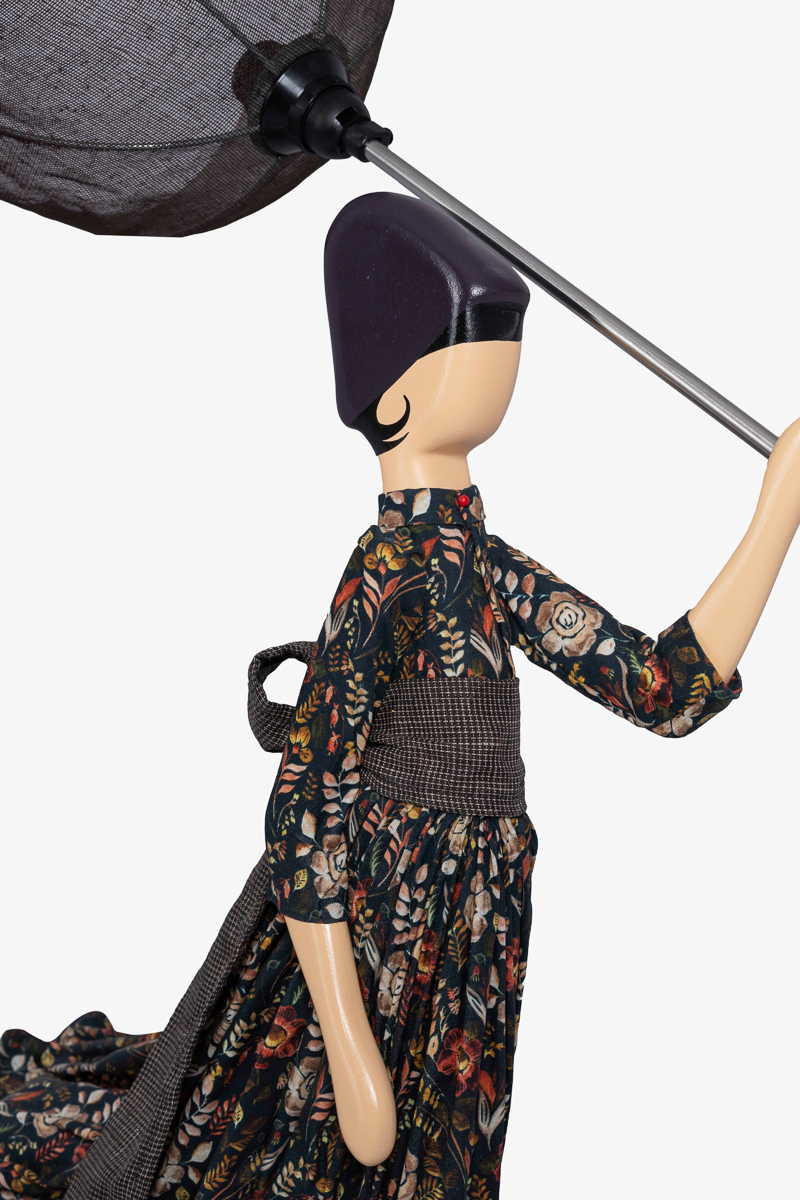 Skitso Little Girl Lamp Argiro ist eine charmante und außergewöhnliche Tischlampe. Wie typisch für die Skitso Girl Lamps gibt es auch hier den verwehten Rock und den Regenschirm als Lampenschirm. Argiro trägt ein dunkles Kleid mit hübschem floralem Muster, eine braune Schärpe und dunkelbraunen Regenschirm.