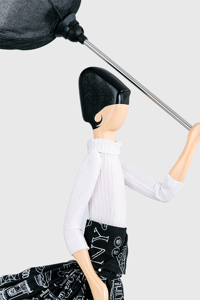 Diese Lampe von Skitso zeichnet sich durch das ungewöhnliche Design aus. Eine Frau mit Schirm und Rock wird vom Winde verweht.