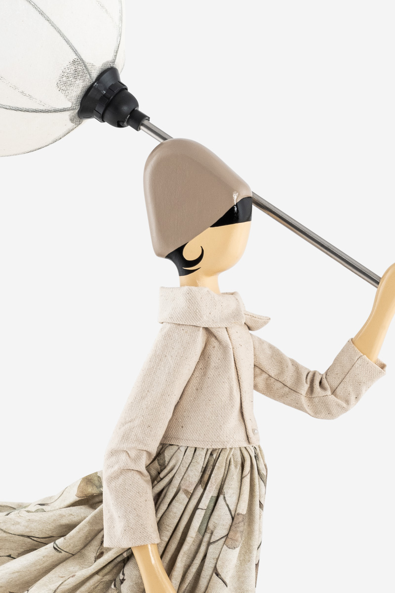 Girl Lamp Choulia trägt einen cremeweißen Regenschirm. Die Bekleidung ist in angenehmen natürlich wirkenden wollweiß-beige-grauen Farbtönen gehalten. Der Webcharakter der Stoffe und das Pflanzenmuster im Rock unterstützen den Landhaus-Look.