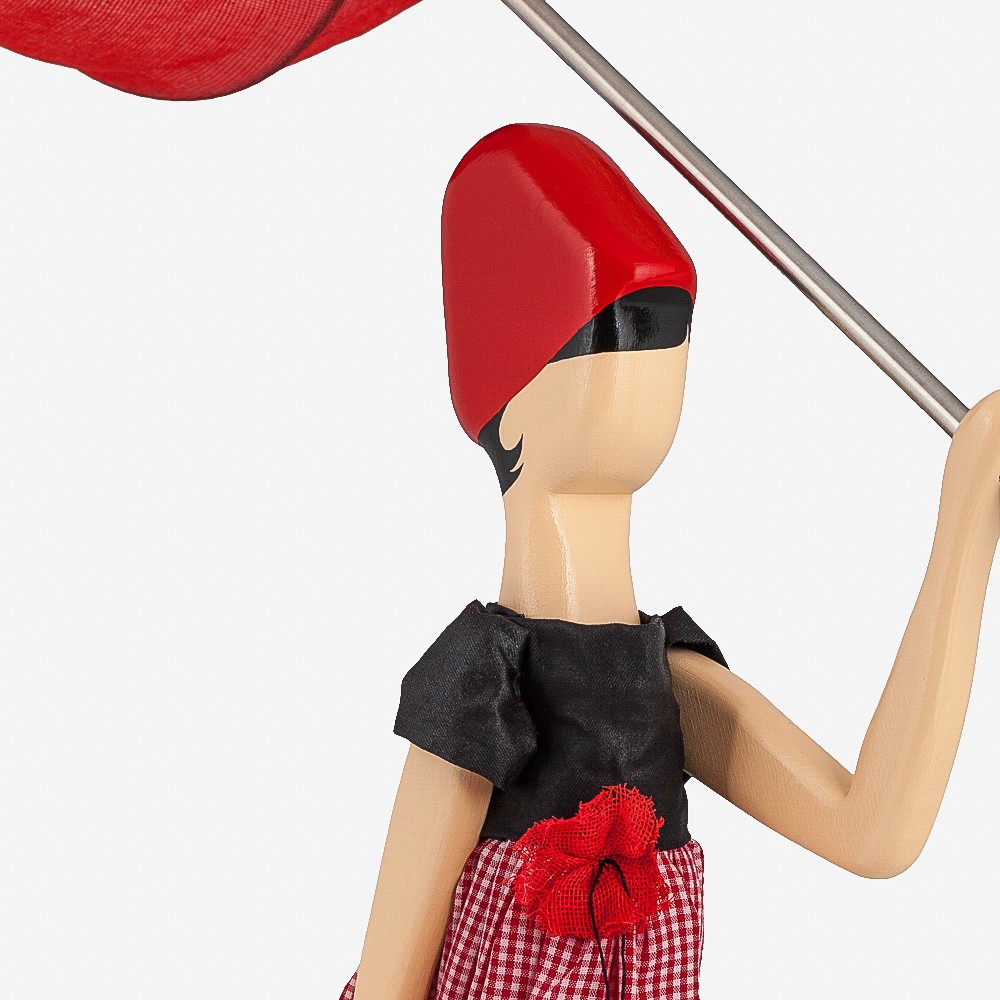 Girl Lamp Cooki von Skitso ist eine kunstvolle Stehlampe mit einem besonderen Look. Bei einem Spaziergang im Regen, wird die Frau von einem Wind erfasst, der Rock und Kleid verweht und den Schirm umklappt. Cooki ist mit ihren klassischen Farben Schwarz und Rot eine dauerhaft beliebte Lampe bei uns. Ihr karierter Rock kommt einfach nicht aus der Mode!