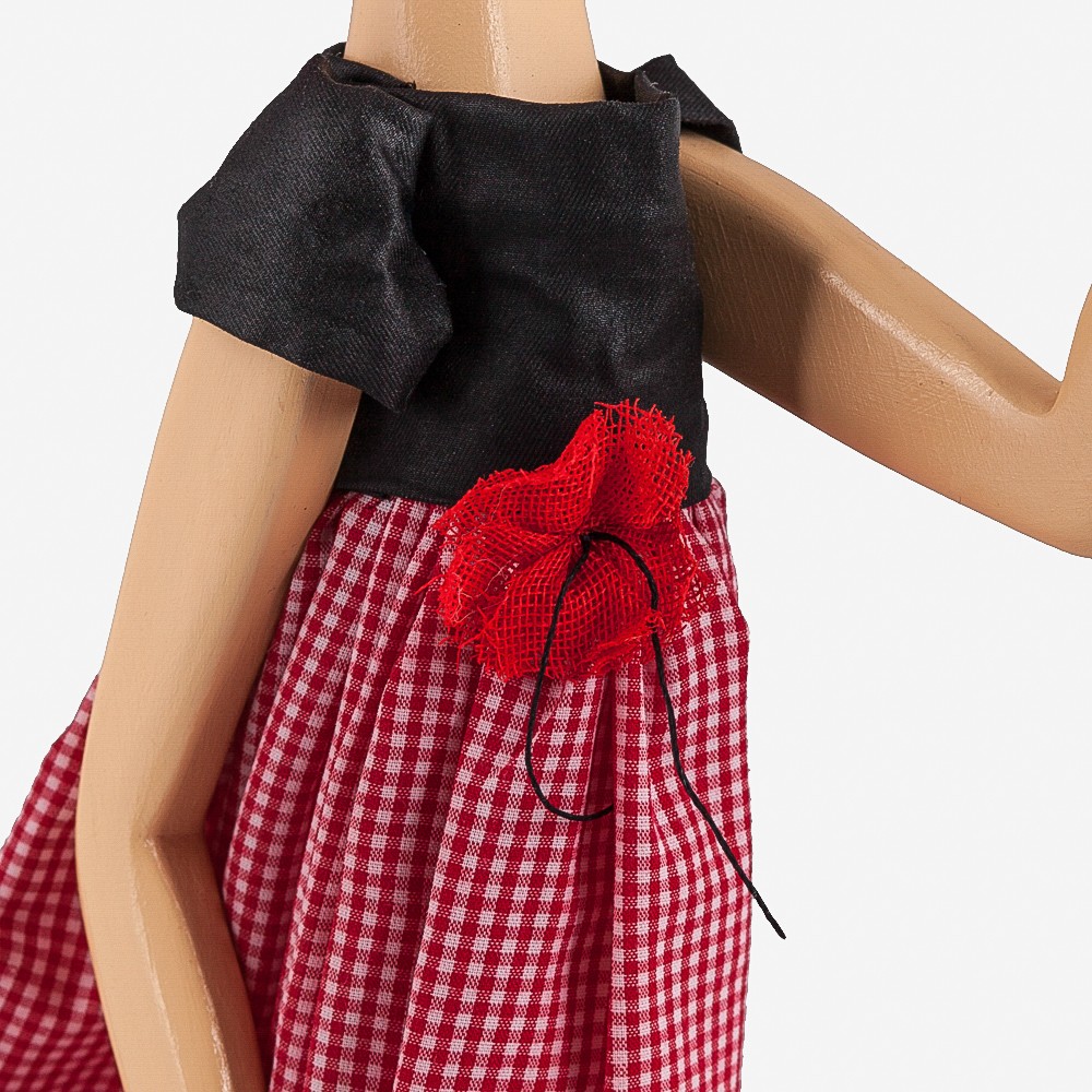 Die Figur besteht aus Massivholz und steht auf einer Holzplatte, die mit Papier beklebt ist. Die Kleidung besteht aus versteiften Textilien.