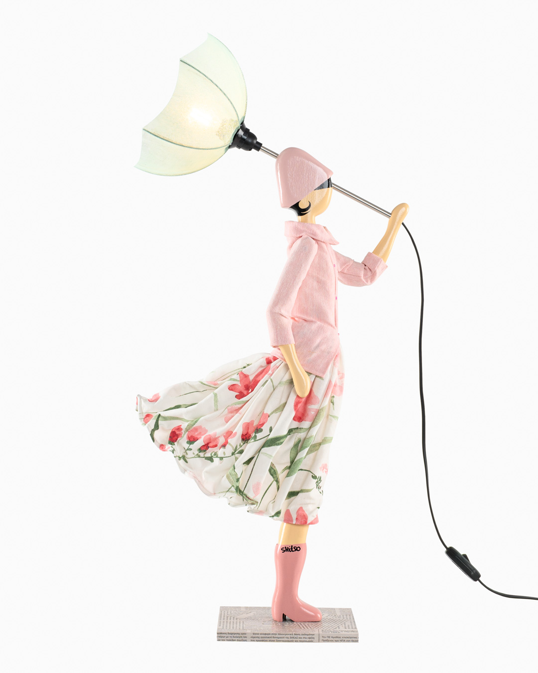 Diese Lampe von Skitso zeichnet sich durch das ungewöhnliche Design aus. Eine Frau mit Schirm und Rock wird vom Winde verweht.