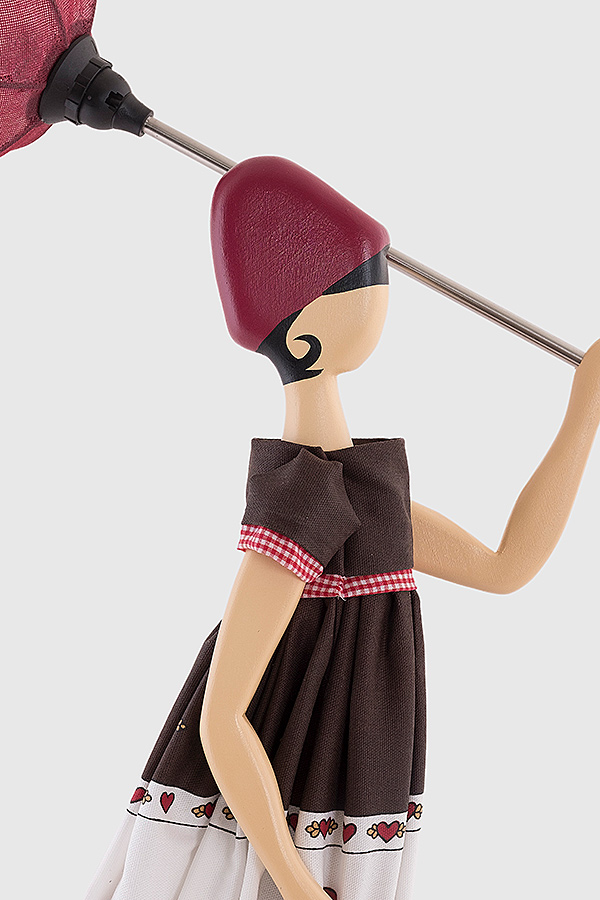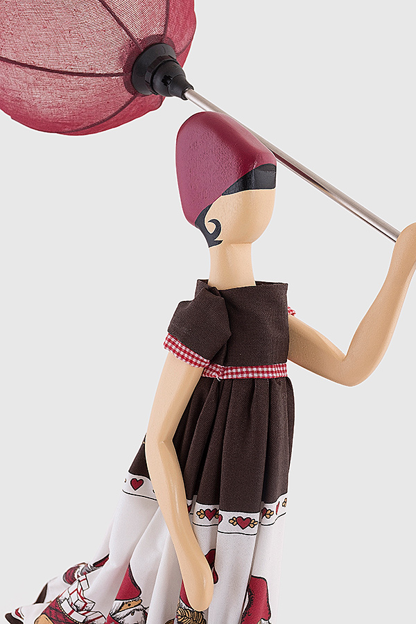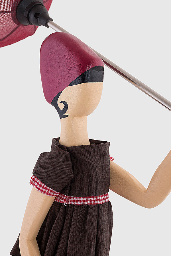 Girl Lamp Eftyhia von Skitso ist eine kunstvolle Stehlampe. Der besondere Look erzeugt eine Herbststimmung. Bei einem Spaziergang im Regen, wird die Frau von einem Wind erfasst, der Rock und Kleid verweht und den Schirm umklappt.