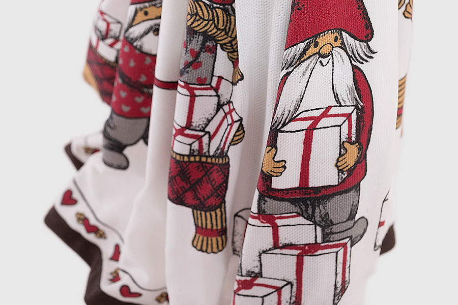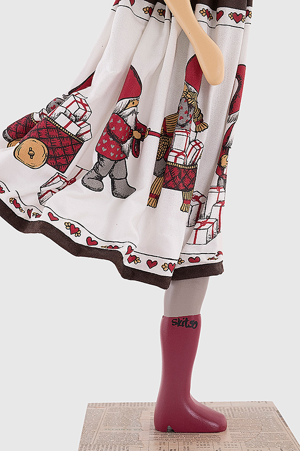 Girl Lamp Eftyhia kommt sehr festlich daher. Sie trägt ein Kleid mit Wichtel- und Geschenkmotiven.
