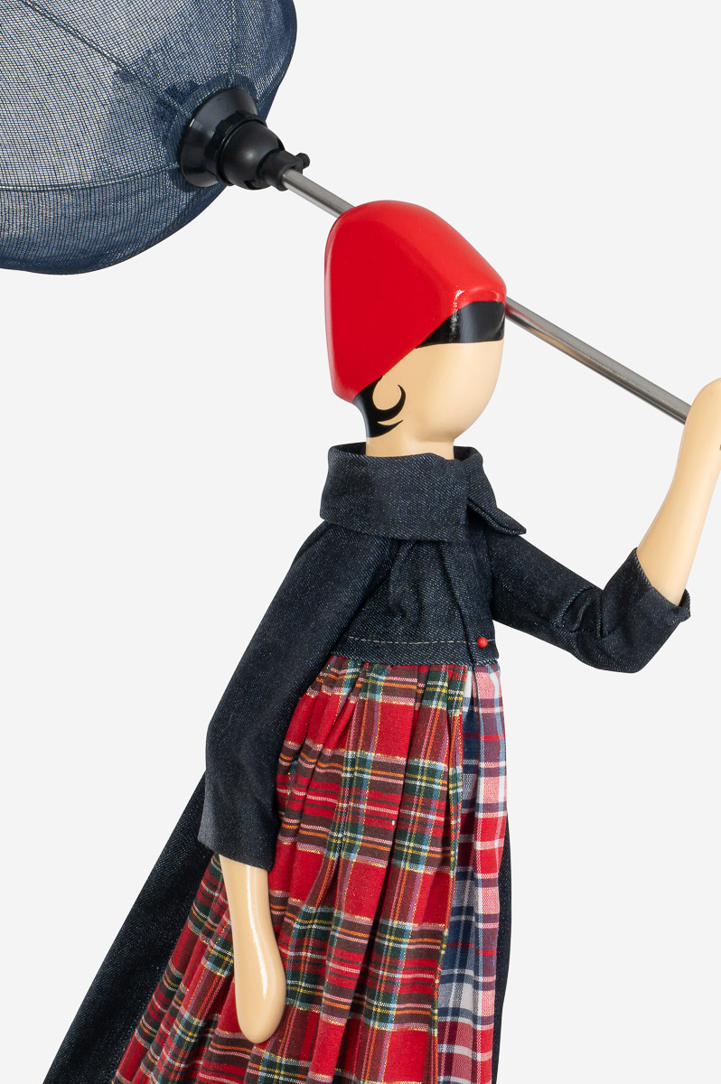 Die Skitsolampen haben einfach diese besondere Idee mit dem Lampenschirm. Bei einem Spaziergang wird die Frau von einem Wind erfasst, der Rock, Mantel oder Kleid verweht und den Schirm umklappt.