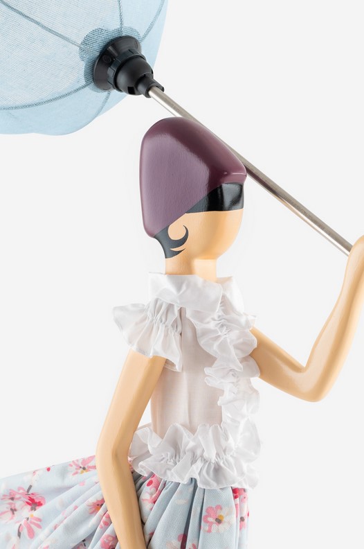 Diese Lampe von Skitso zeichnet sich durch das ungewöhnliche Design aus. Eine Frau mit Schirm und Rock wird vom Winde verweht.